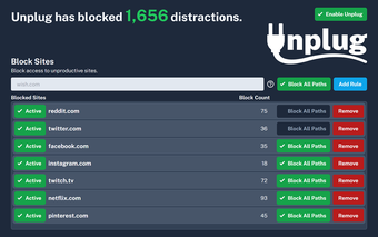 Además de su funcionalidad de bloqueo, Unplug ofrece una página de bloqueo motivacional que muestra citas inspiradoras cuando se accede a un sitio bloqueado. También cuenta con la opción de protección por contraseña para evitar cambios no deseados en la configuración. La información sobre las listas de bloqueo y permitidos se almacena de forma segura en el almacenamiento sincronizado del navegador, garantizando la privacidad del usuario sin recopilar datos personales ni historial de navegación.